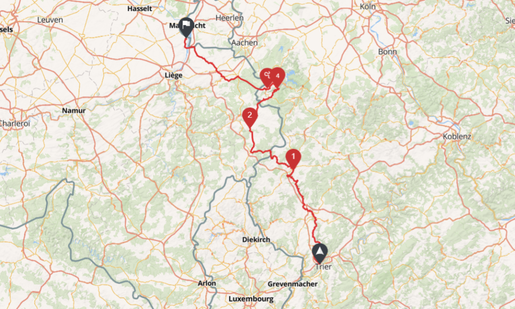 240 km, 4hrs windy roads along DE-BE border, ending at Fort Eben-Emael
