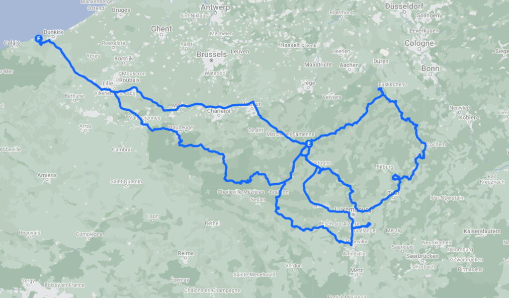 - Saturday 24th June, Day 1: 8am Ipswich to Chem. des Eveux 5, 6980 La Roche-en-Ardenne, Belgium. 450km (280 miles) + ferry. Long day. Hardcore.